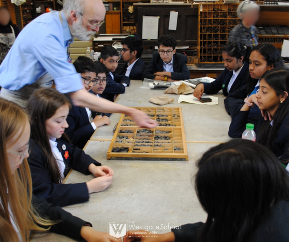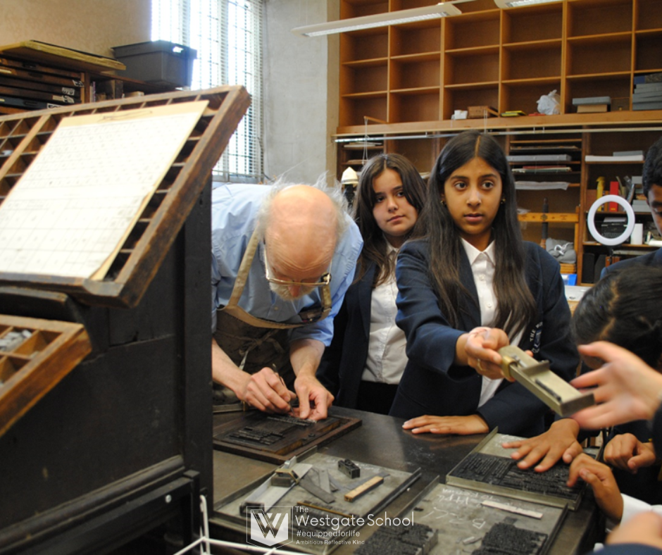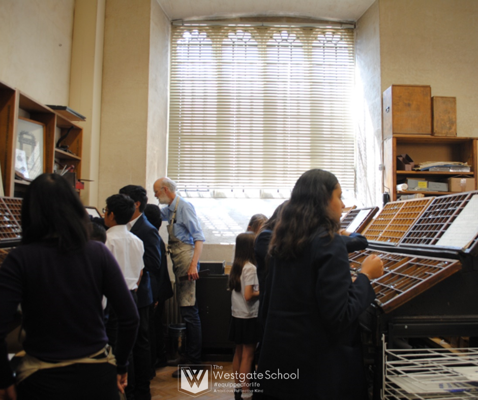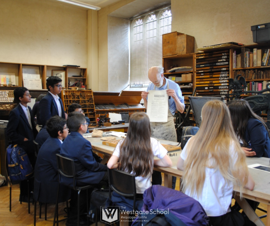 On Monday, 10 June, Ms Mulligan and Mrs Mansbridge took 14 students to Oxford for a visit with the Bodleian Libraries education team. In the University's printing room, they learnt how books had been printed for centuries, handled printing materials, and experienced the craft and labour involved in creating a printed book. After selecting and arranging letters for print, students were able to use the historic letterpress printing equipment to make a keepsake to print and take home. They also printed an exact replica of the first page of the Tempest from Shakespeare's first folio.