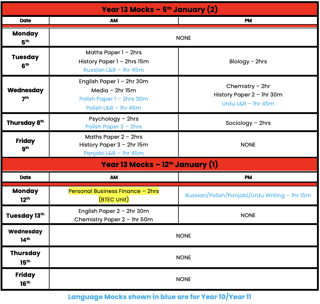 Year 13 January Mock Timetable - 2026